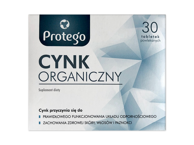 Protego Cynk Organiczny (suplement diety) zawiera cytrynian cynku – dobrze przyswajalną sól organiczną. Opakowanie 30 tabletek wystarcza na miesiąc stosowania przy dawkowaniu 1 tabletka dziennie. Brak szczegółowych informacji o składzie pomocniczym i przeciwwskazaniach.