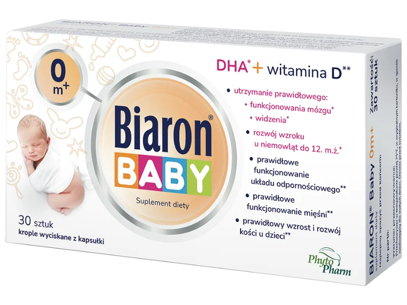 Bioaron Baby 0 m+ oraz D-Vitum z DHA to kapsułki, które można przekręcić i wycisnąć zawartość bezpośrednio do buzi niemowlęcia lub dodać do pokarmu. Są wygodne dla rodziców i bezpieczne dla najmłodszych dzieci.