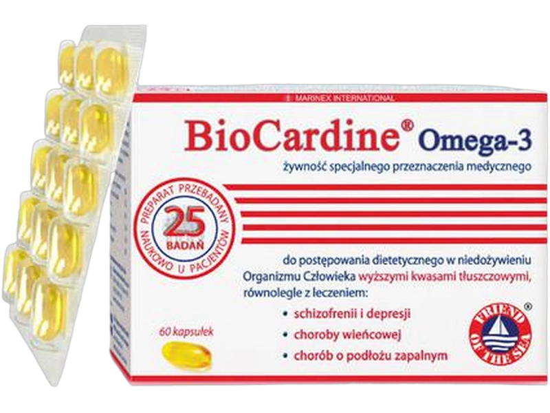 | Biocardine omega-3 | 1759 mg EPA + 1115 mg DHA w 5 ml | 5-15 ml dziennie | Żywność specjalnego przeznaczenia medycznego, płyn |