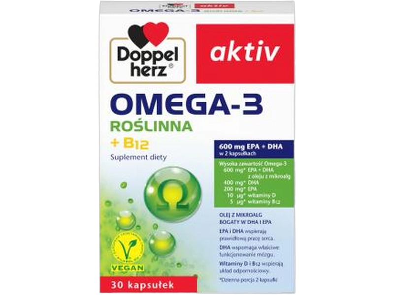 | Doppelherz Aktiv Omega-3 Roślinna | 200 mg EPA + 100 mg DHA w 2 kapsułkach | 2 kapsułki dziennie (1 kapsułka dla kobiet w ciąży) | Wegański, z oleju z alg, zawiera witaminę D i B12 |