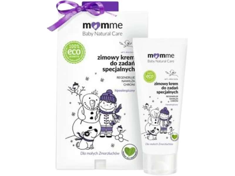 Do kluczowych preparatów należy krem Momme Ochronny Parasol Od Słonka SPF50, oferujący zaawansowaną osłonę przed działaniem promieniowania UVA oraz UVB. Formuła zawiera ekologiczne, certyfikowane filtry fotoprotekcyjne wzbogacone o składniki aktywne — betainę, olejki z migdałów słodkich i pestek arbuza, tokoferol oraz bisabolol, które nawilżają i łagodzą naskórek. Drugim istotnym produktem jest krem Momme Zimowy do zadań specjalnych, stworzony do stosowania w trudnych warunkach pogodowych. Jego unikalna kompozycja pozbawiona wody pozwala na efektywne funkcjonowanie w niskich temperaturach, formując warstwę izolacyjną chroniącą przed mrozem, wiatrem i chłodem. Oba dermokosmetyki przeszły testy dermatologiczne i alergologiczne, potwierdzające ich bezpieczeństwo dla skóry wrażliwej.